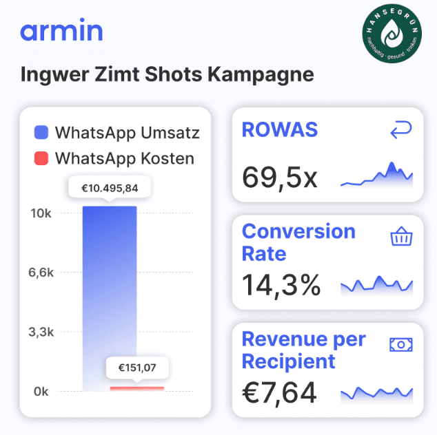 Mit einer einzigen Kampagne erzielte Hansegrün einen 69,5x Return on WhatsApp Spend – bei gerade einmal €151,07 Einsatz.